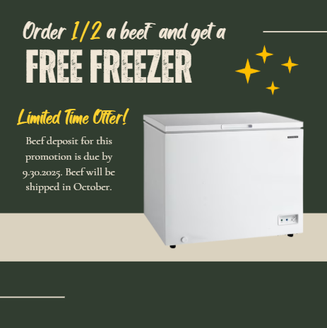 For the month of September only! We are excited to offer you a FREE freezer with the purchase of 1/2 a beef!